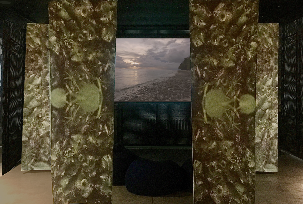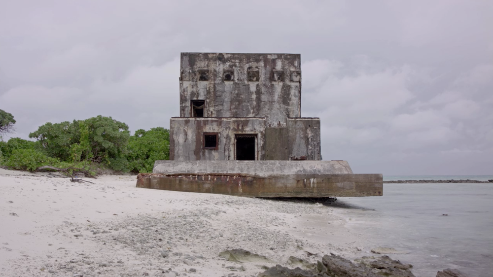 Charrierè’s video work captures the structures’ of the Bikini Atolls’ atomic-industrial architecture decay, its manner of editing further suggesting morphological overlaps with the monstrous wrecks lying on the bottom of the Bikini Atoll lagoon, assailed by tide and time. Making no use of archival material — its original underwater images captured at depths far below standard dive profiles — Iroojrilik is unquestionably the most unique and comprehensive perspective on the maritime ruins of Bikini ever put together. Yet, rather than explicating individual vessels or buildings, the cumulative impression given is that of an Atlantis or lost civilisation— architectural features of one ship cut together with those of others, such that it appears as though a submerged mega-structure has been discovered. On a more general note, the film employs another series of elisions and substitutions. Through a series of montages, mixing sunsets and sunrises, it proposes an uncertain distinction between daybreak and nigh fall—first light of a new day in Pacific history, and the waning of another. Visions of multiple suns and endless dawns stretch across the horizon. Pictorial energies shift and sway, like palm trees and coral ferns growing on cannon mounts, between construction and destruction, transporting the viewer to a “non-place,” or the beginning of a brave new world.