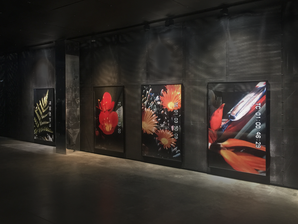 TC Studies are photographs of tilting video camera flip screens capturing a specific moment anchored in time, their ephemerality frozen, recorded, and contained. The many facets of natural flora reduced to a flat surface now seen on a screen then rephotographed once more adds a second viewpoint depicting multiple levels of viewing, and in turn multiple levels from the source. An image on a small LCD screen is reinstated as 180-centimetre tall macro photos of glass pixels, which mirror the grid of the metallic walls they hang on. If time in nature is filtered through technology then it is Snapp’s ability to transform this back into a state both sculptural and organic that delivers a destabilising reversal.